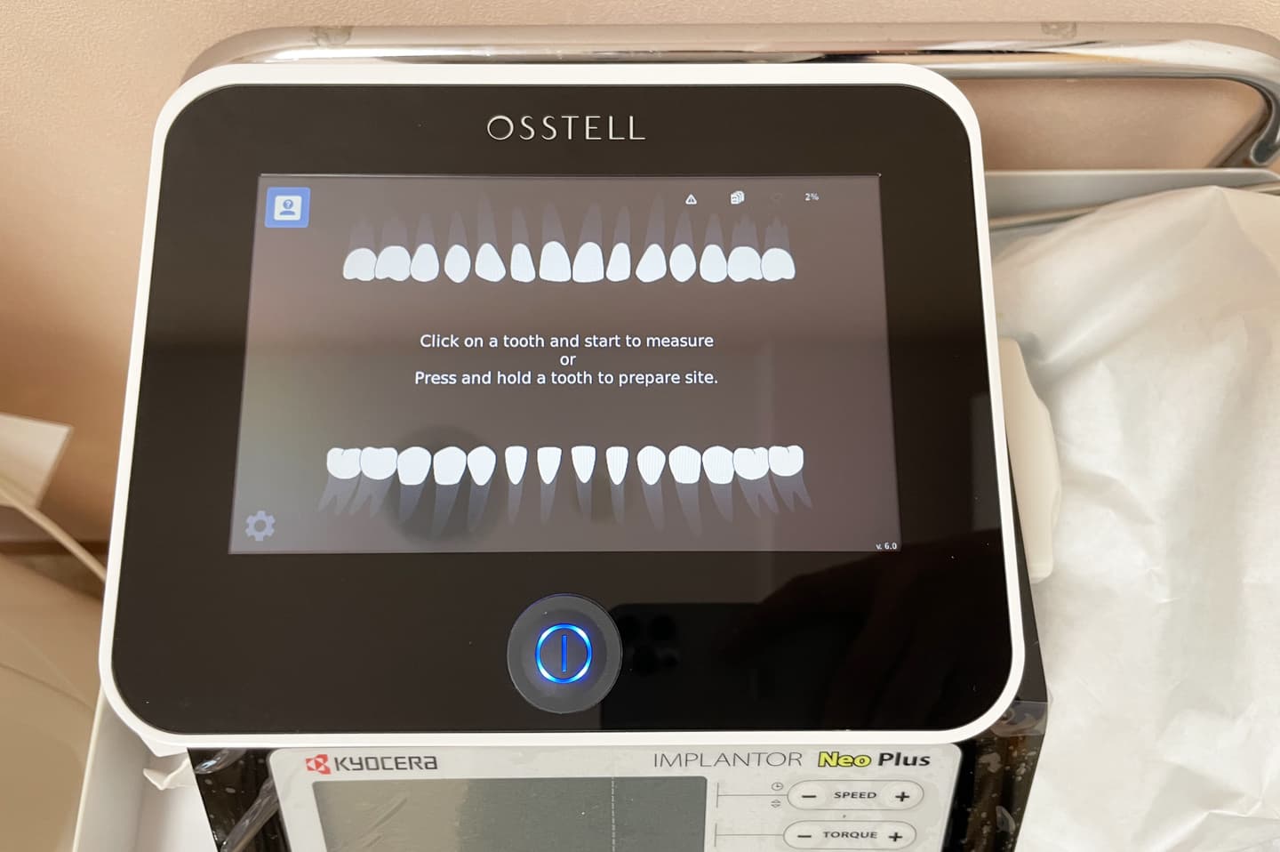 主にインプラントの即時修復(オペと同時に仮歯まで入れる治療)の時に使用します。 インプラントの安定度を計測する機械です。